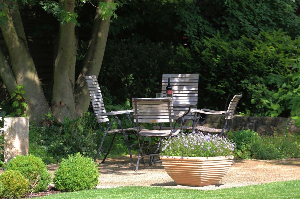 Garpa Holzmöbel, schattiger Sitzplatz unter großen Bäumen