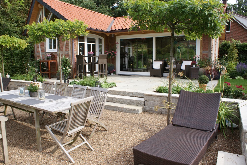 begrenzter Raum für einen ganzen Garten, Sandsteinplatten und Klinker-Bänderung