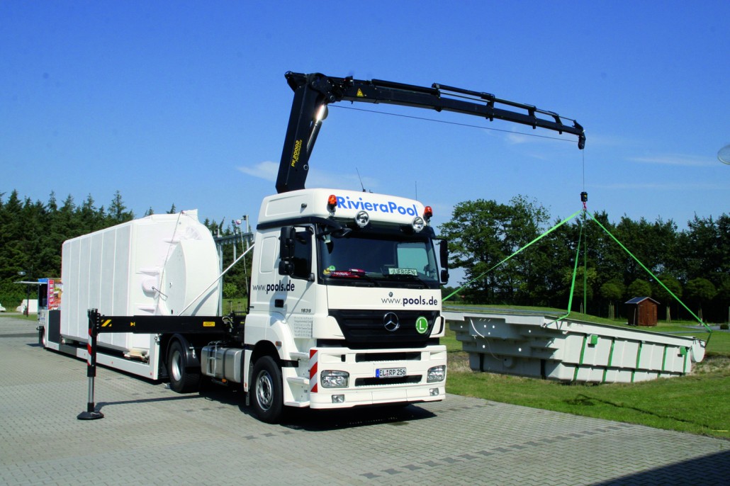 Der Transport eines Fertigpoolbeckens ist unkomplizierter als man denkt, der Einbau erfolgt mit Hilfe eines Autokrans. Der Vorteil eines Fertigbeckens ist die kurze Bauzeit!!