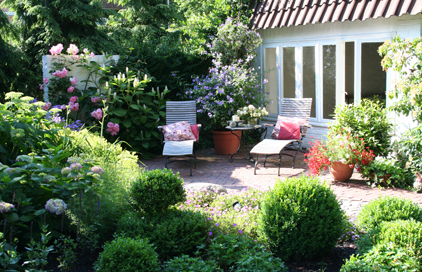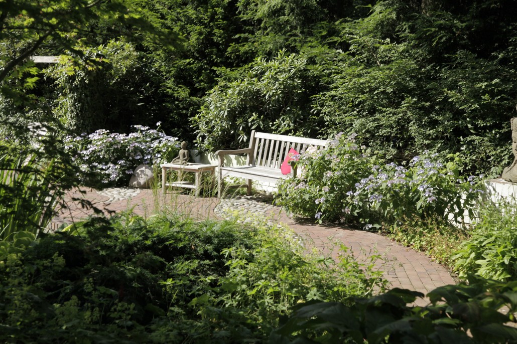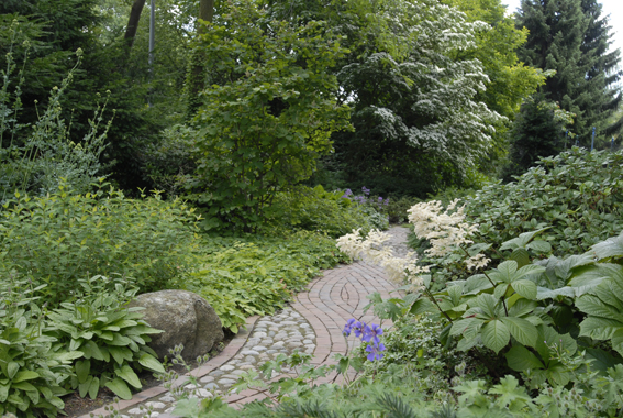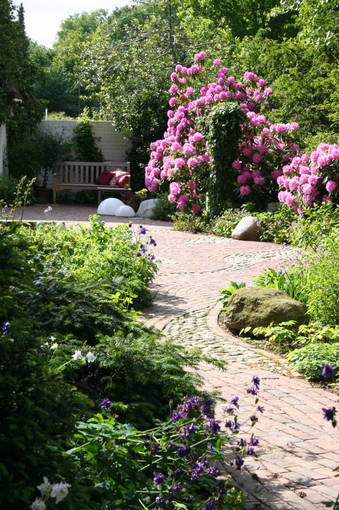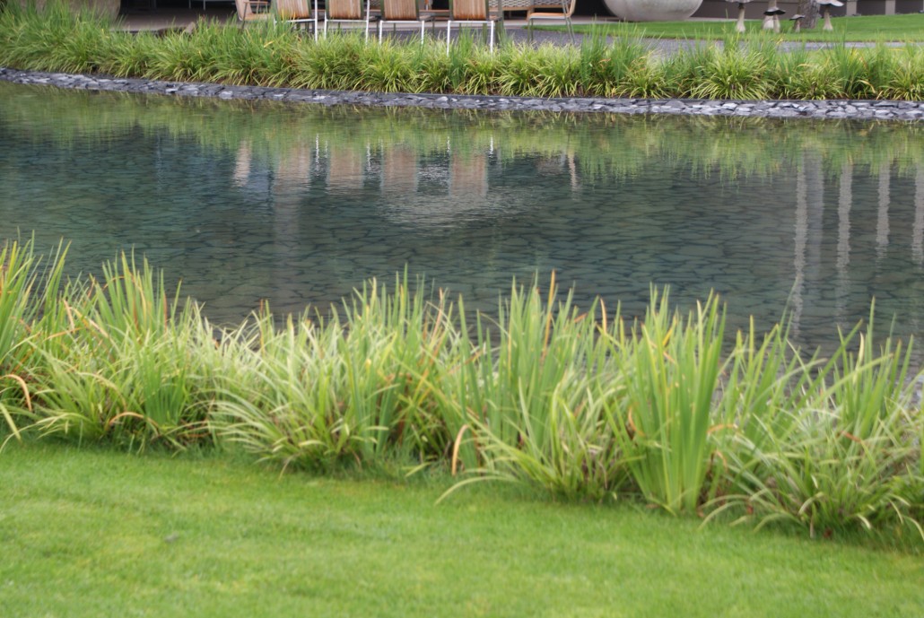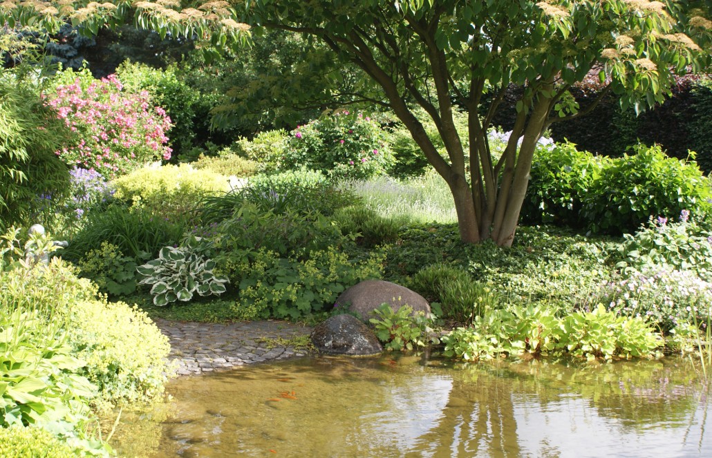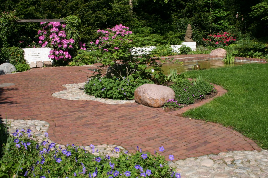 Wasserwellen und eine fließende Bewegung lassen sich auch in Bepflanzungen oder einer Pflasterung nach empfinden. Dabei wird das Element Wasser durch eine blaublühende, farbsortierte Staudenauswahl oder mit organisch, fließenden Formen (z.B. in Pflasterungen oder der Beeteinfassungen) unterstützt.