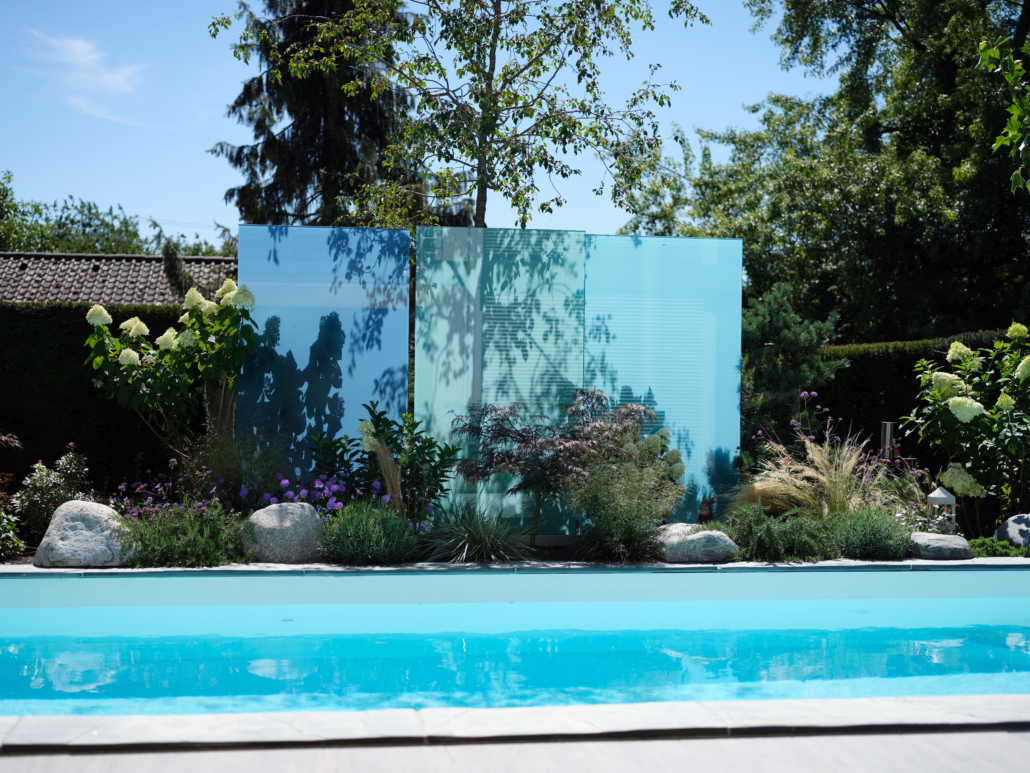 Entdecken Sie unsere innovativen Glas-Designelemente von (KNUMOX), die vielfältige Möglichkeiten zur außergewöhnlichen Gestaltung von Gärten, Parks und Dachterrassen bieten. Durch das Spiel von Licht und Schatten werden die farbigen KNUMOX Glaswände zum minimalistischen Gestaltungsobjekt im Außenbereich. Die KNUMOX Linien aus Glas in drei Transparenzen eignen sich für zeitlose Garten- und Landschaftsgestaltung. Wählen Sie aus der umfangreichen Farbpalette, um Ihren individuellen Look zu kreieren.